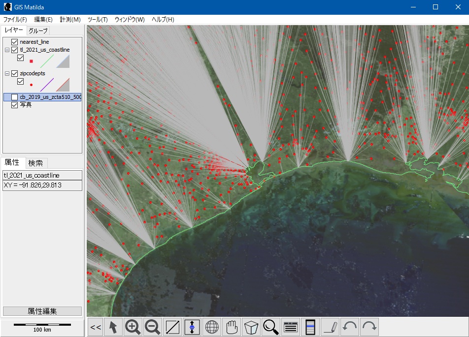総当たりの最短距離計測図形を実行すると全ての郵便番号ポイントから「どの海岸線のある指定ポイントに近いか」がわかるようになります。