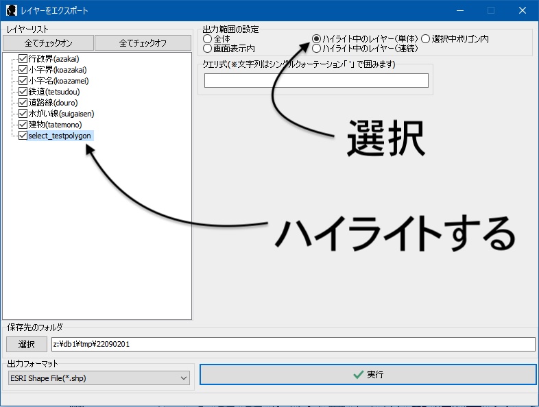 フォーム左側のレイヤーリストでどのレイヤーを使うかを決めます。その後「ハイライト中のレイヤー(連続)のオプション」からフォルダ分け(またはファイル名分け)に使うフィールド名を決定します。